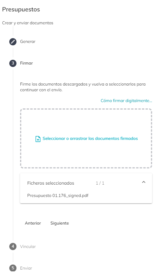 Una vez firmados los documentos, es necesario seleccionarlos de nuevo desde el asistente para continuar con el proceso de envío de documentación.