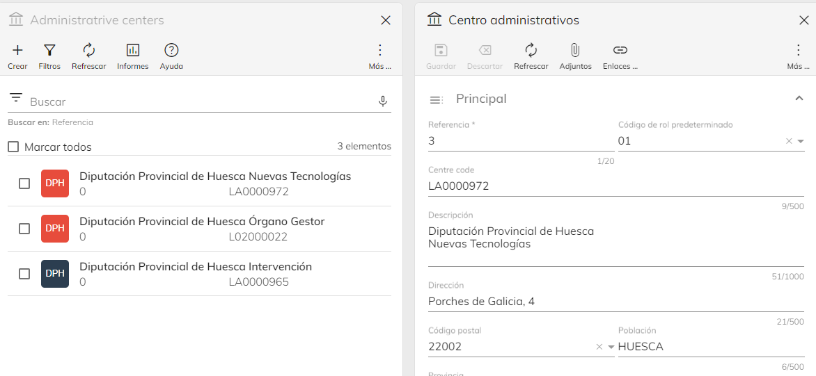 Cada Centro Administrativo, debe tener asignado un Código de rol predeterminado, un Código de centro, una descripción y una dirección, código postal, población provincia y País.